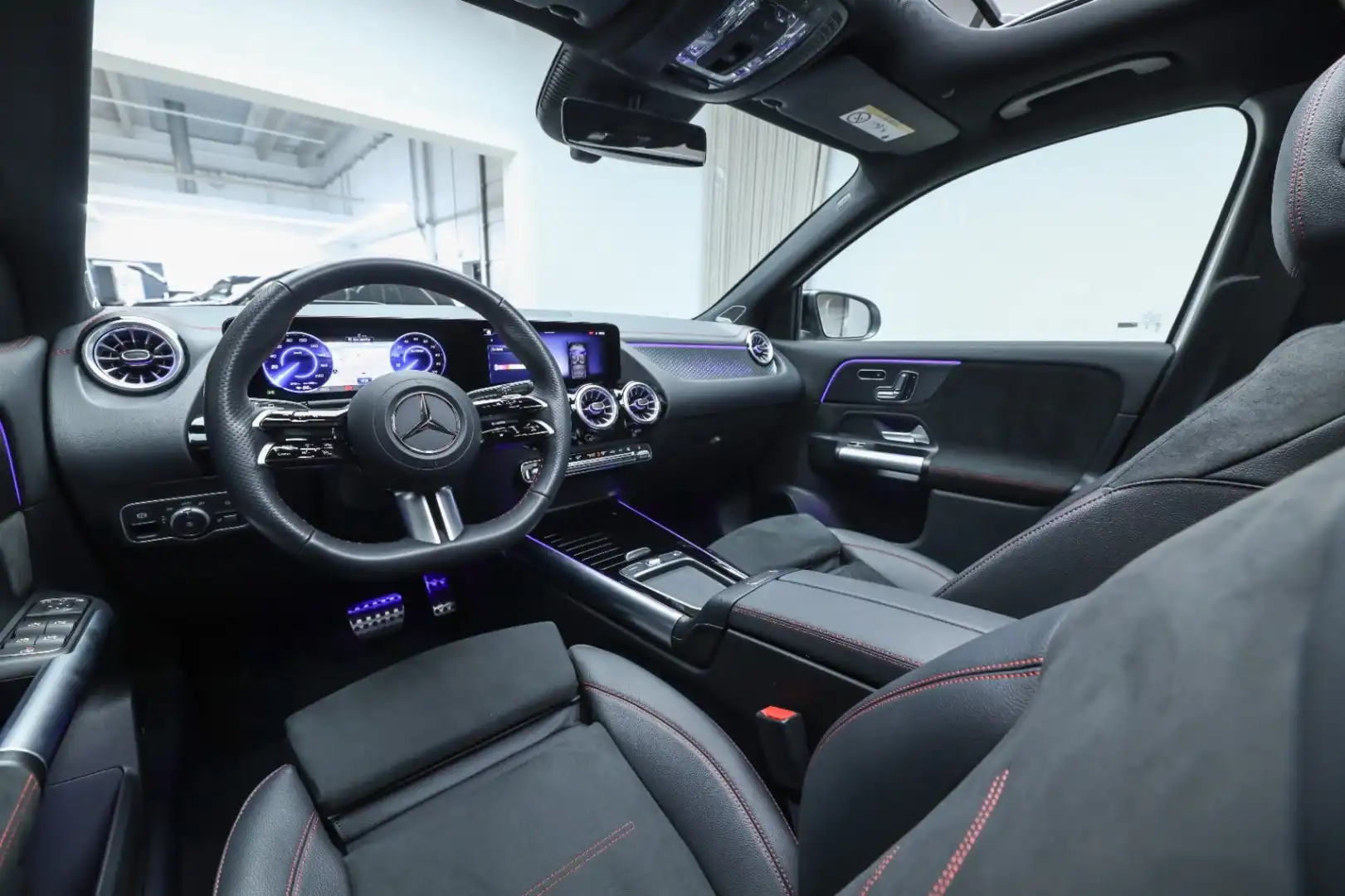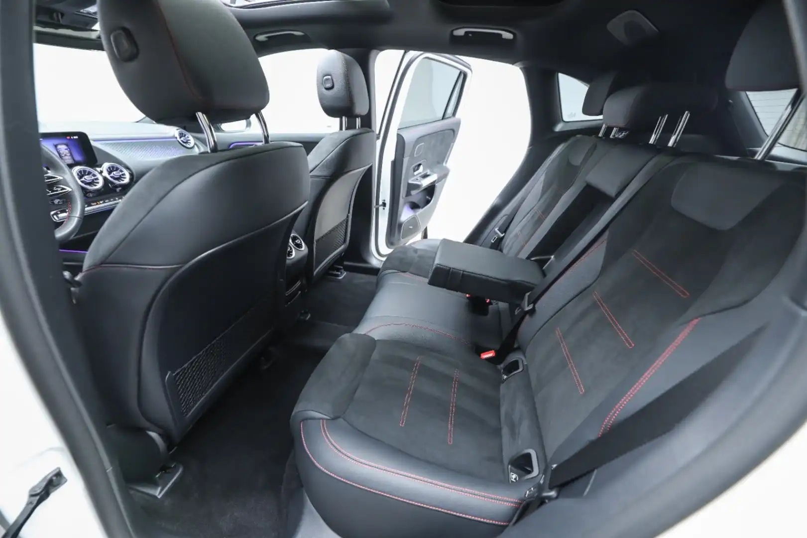 Design: Polarhvid, AMG Designlinje, Nightpakke, 18" AMG letmetalfælge i 5-eget design, ARTICO kunstlæder/MICROCUT mikrofiber sort, Taghimmel sort, Fladbundet multifunktionssportsrat i nappalæder, AMG bundmåtter, Interiørliste med stjernemønster belyst, Interiørlister med belysning, Varmeisolerende og mørktonede ruder, Ambiente belysning (64 farver), Tagræling i sort, Projektion af logo, Belyste trinlister med logo,