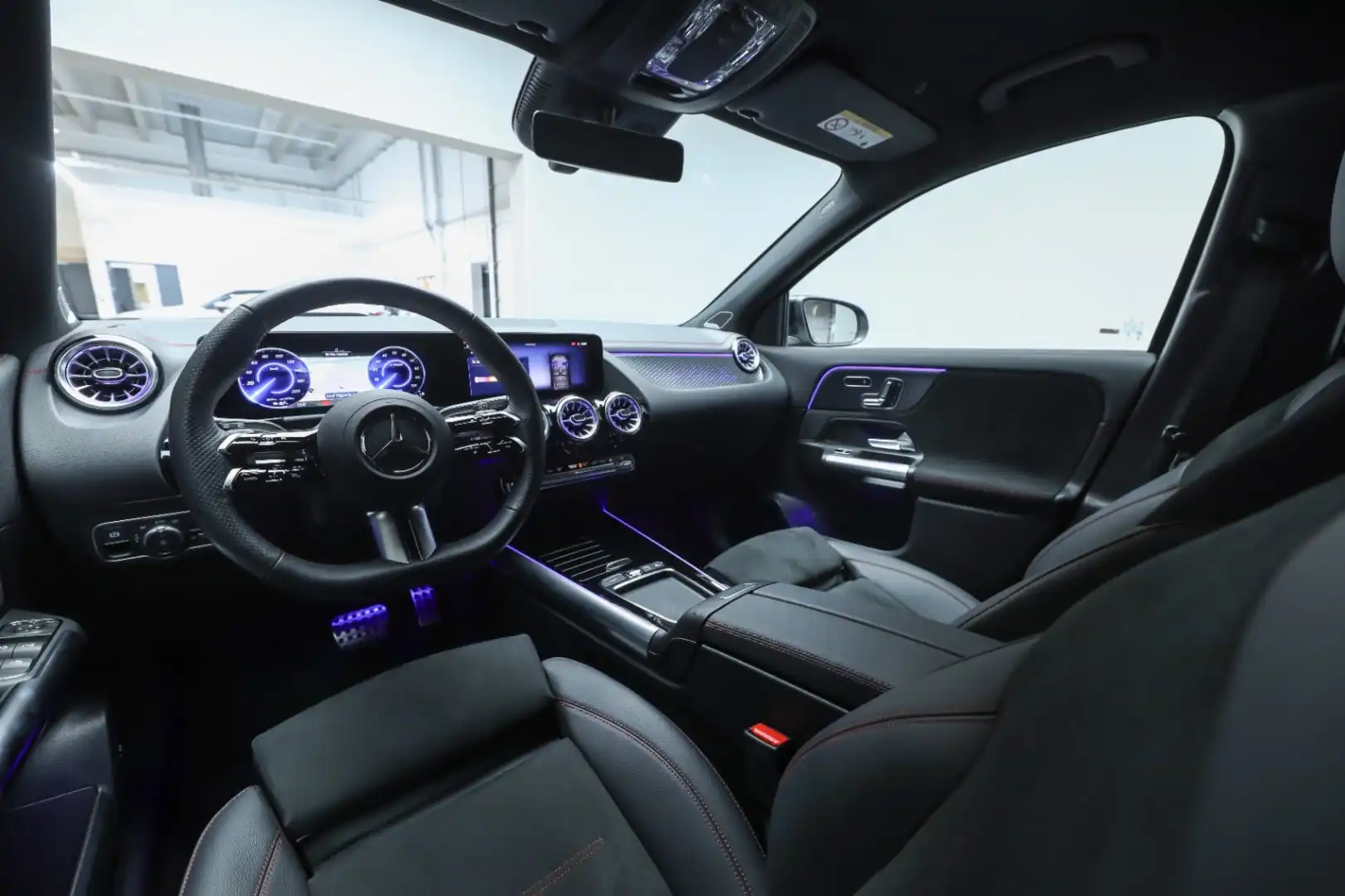 Design: Natsort, AMG Designlinje, 18" AMG letmetalfælge i 5-eget design, ARTICO kunstlæder/MICROCUT mikrofiber sort, Taghimmel sort, Fladbundet multifunktionssportsrat i nappalæder, AMG bundmåtter, Interiørliste med stjernemønster belyst, Interiørlister med belysning, Varmeisolerende og mørktonede ruder, Ambiente belysning (64 farver), Tagræling i poleret aluminium, Projektion af logo, Belyste trinlister med logo,