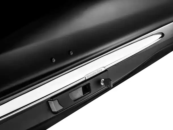 En tagboks fra Mercedes-Benz giver dig mulighed for at transportere vinter- og sommer tilbehør såsom ski, snowboard, dukkerudstyr osv. Tagboksen overholder sikkerhedskrav fra TÜV og er samtidig crashtestet ved bykørsel og ved høj hastighed. Tagboksen er produceret i genanvendeligt thermoplastik for at opnå den velkendte kvalitet fra Mercedes-Benz. Det betyder at tagboksen er robust, slidstærk og gennemfarvet, så boksen holder sin farve, selv i forbindelse med små stenslag. Ulastet vægt 23kg. Maksimal lastkapacitet: 75 kg.
